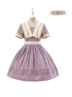 The dress is made of cotton jacquard fabric, with a sailor collar design and lace trim at the cuffs, lively and cute, and matched with an apricot lace belt highlighting the waist.