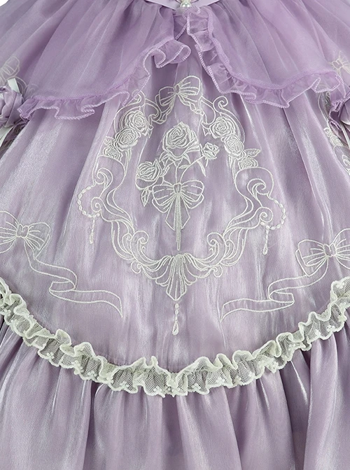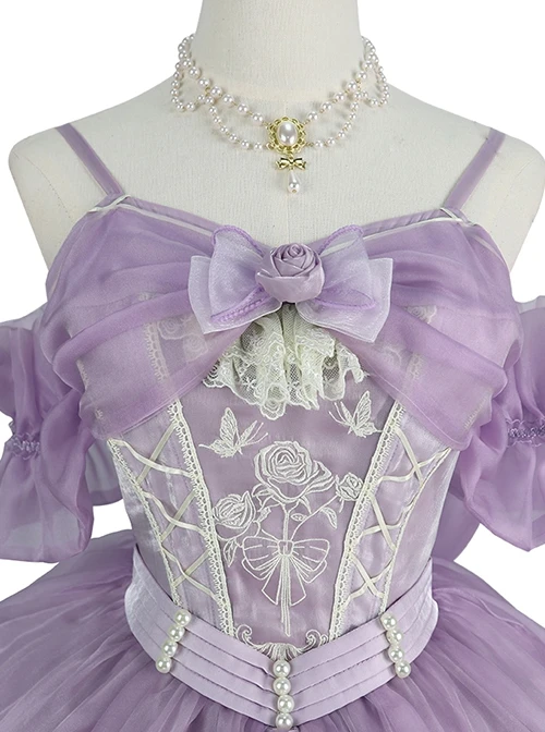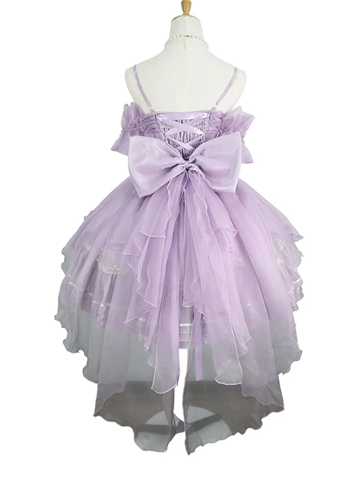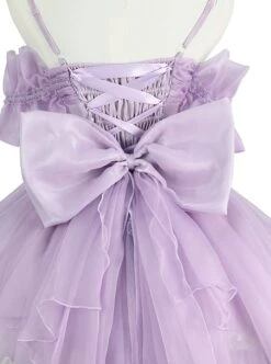 With a big purple bowknot and detachable flower bowknot, the irregular skirt is flexible and elegant