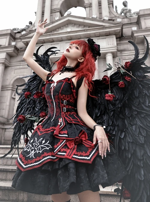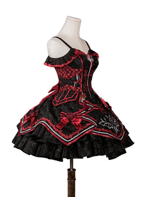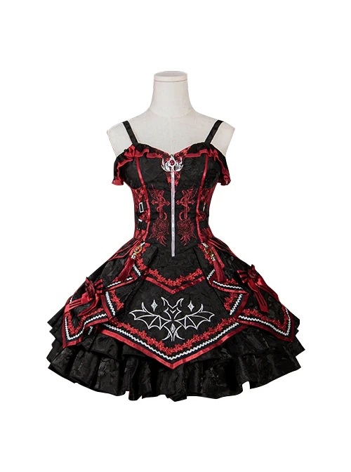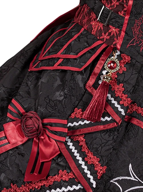 Black and red jacquard fabric, front zip fastening, bat cross embroidered tassel bowknot decorative design ornate