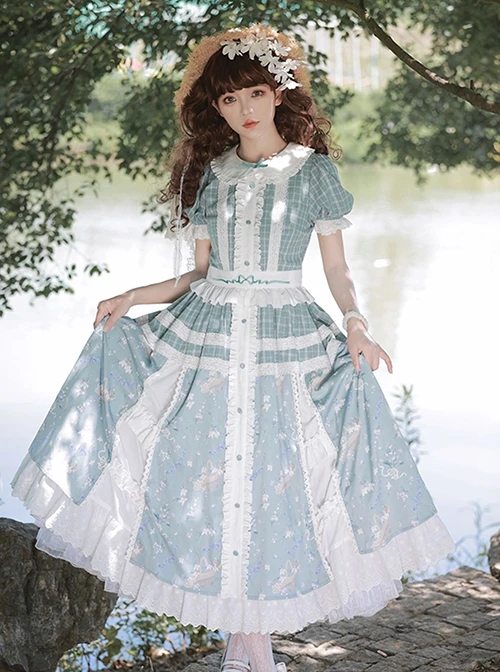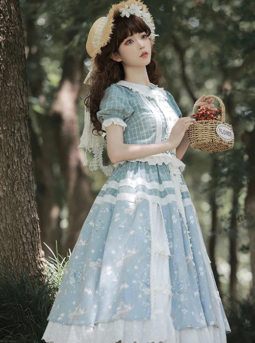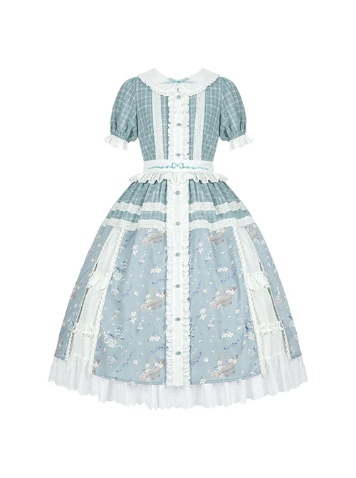 Retro print plaid stitching, cute doll collar, and bowknot embroidery, everyday and elegant.