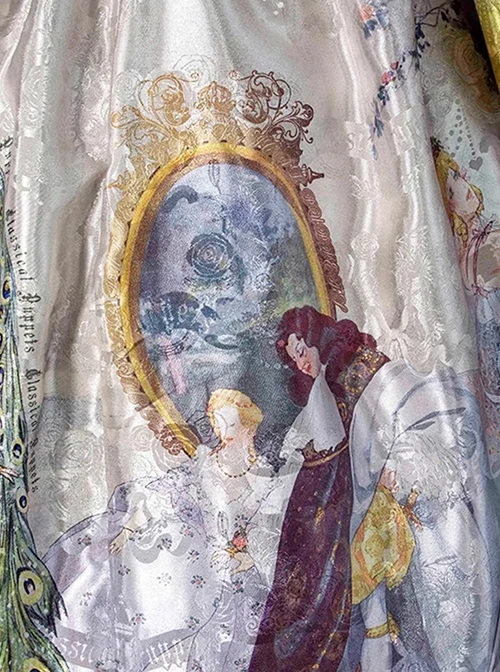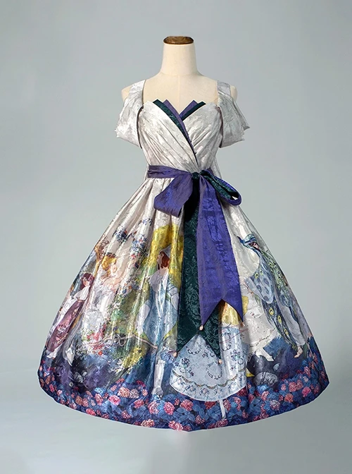 Mid-length Watteau dress with fairy-tale print, large hem, three-dimensional cut design, with pockets and a detachable belt.