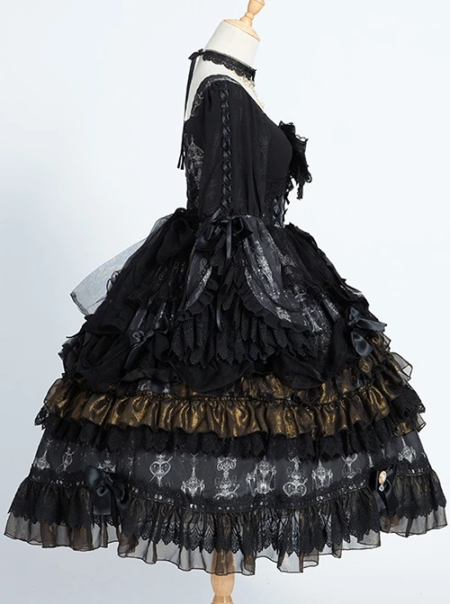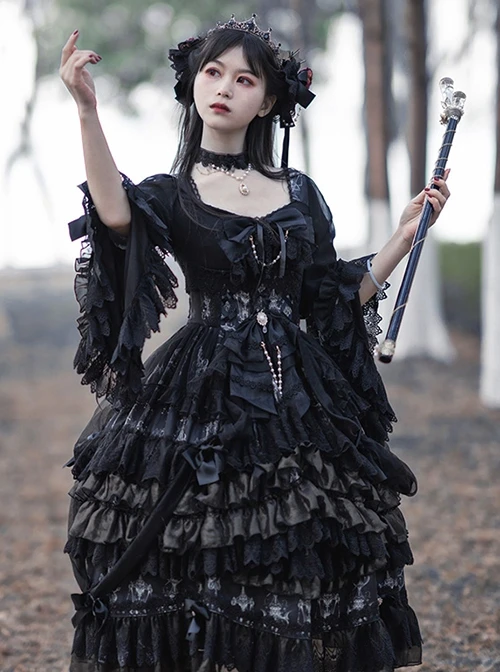This dress is very retro and gorgeous. The neckline is a pentagonal square collar with bows and pearls. The sleeves are decorated with multiple layers of lace, the waist is designed, and the skirt is composed of layers of ruffles, which are very delicate. This skirt comes with accessories such as a train and a veil for matching.