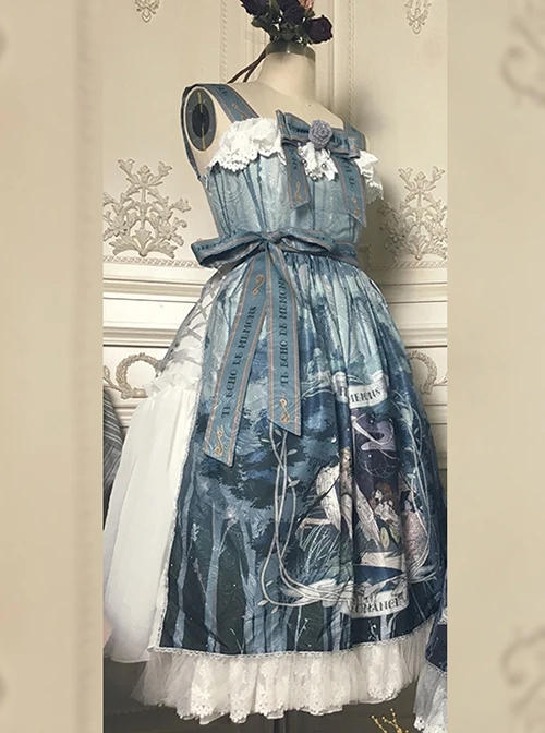 A classic dress for everyday use, very versatile and beautiful, available in a variety of colors. The dress has a regular and elegant shape, with a lace-up bow belt at the waist, and the hem has a mythological messenger-themed print and is decorated with white lace.