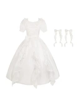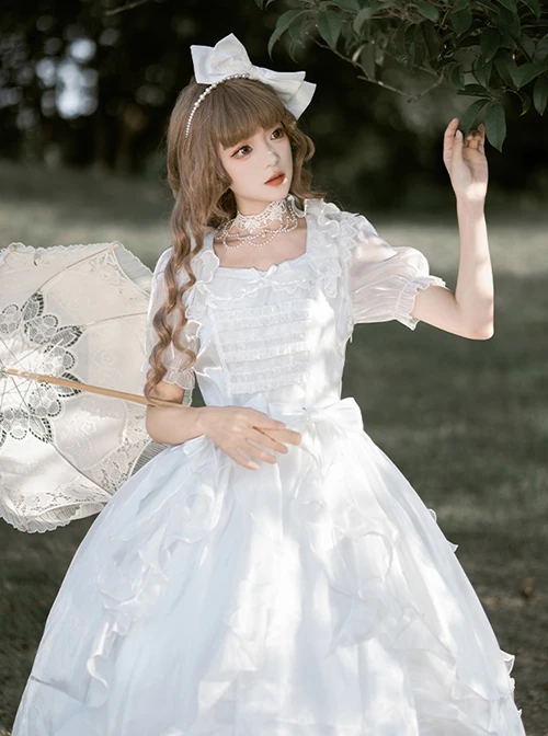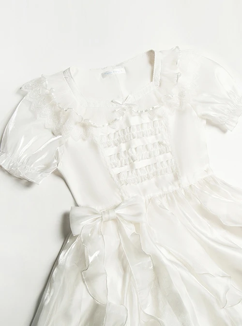 White mesh wedding dress with slightly transparent puff sleeves, embroidered baby doll collar, and ruffled bowknot.