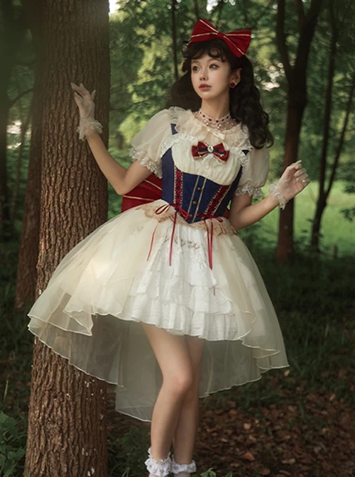 The dress is inspired by Snow White in the fairy tale. It has a classic color scheme of red, blue, and white. The fishbone waistline modifies the body curve, and the tail behind the skirt adds a sense of layering.