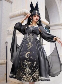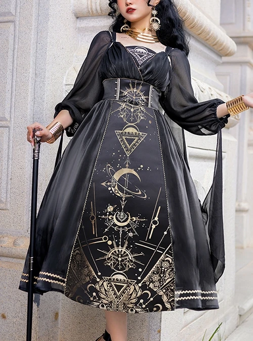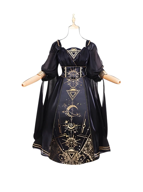 Ancient Egyptian exotic black net yarn golden print gorgeous sleeveless dress set