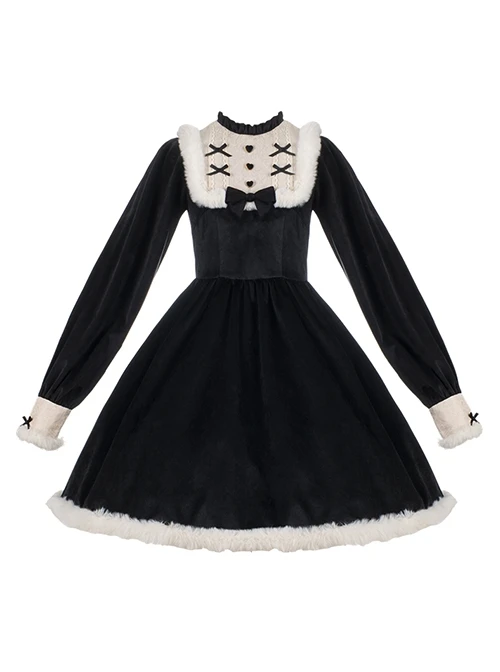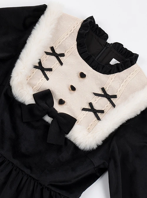 Sweet round neck design, plush wrapped delicate bow heart value, retro puff sleeve design, black velvet fabric