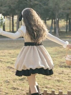 The dress suit is mainly in apricot and black colors. The lamb velvet fabric is soft and comfortable, and its natural curls are very much like a lamb. The hem is in the shape of a flower bud, spliced with a layer of black ruffles.