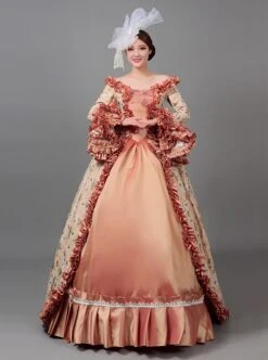 Gorgeous Dreamy Pink Lace Hollow Out Neckline Golden Embroidery Drawstring Sweet Lolita Prom Long Sleeve Dress