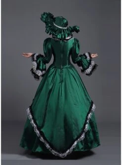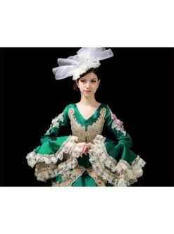 Green V-shape Neckline Dark Golden Embroidery Retro Lolita Prom Long Sleeve Dress