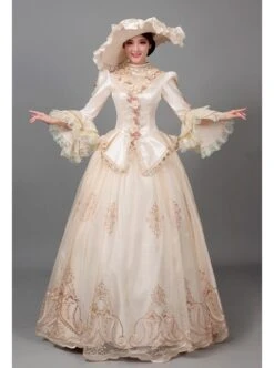 Retro Elegant Long Beige Lace Long Sleeve With Decorative Flowers Prom Lolita Dress