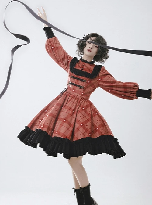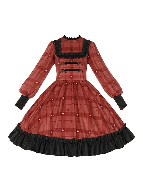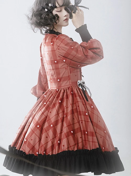 The dress has a unique berry red color, dark and light plaid patterns, and small white hearts to add details. The black lace part adds to the layering of the skirt, making it even sweeter and more playful.