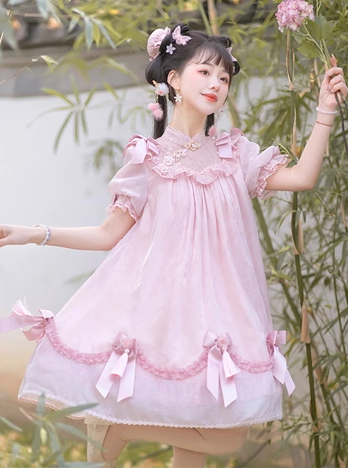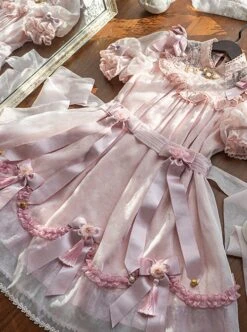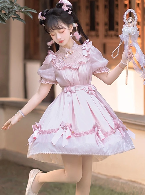 Lace stand-up collar with delicate values, lace pattern with pearl details, puff sleeve design is cute, bowknot and small bells on the skirt