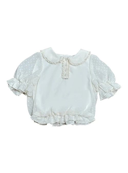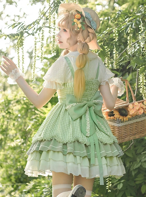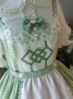 Doll collar white polka dot lantern sleeve top, cute bunny print apron, green plaid fresh daily sleeveless dress.