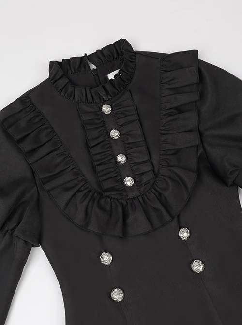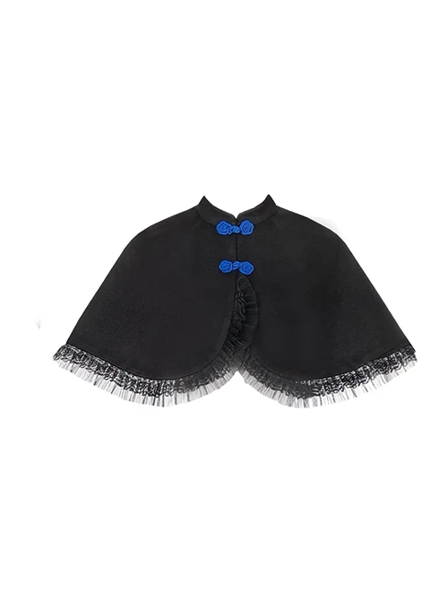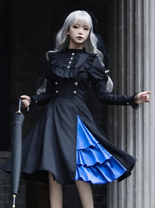 This is a suit with a dress and a cape. The black and blue contrasting colors are eye-catching. The dress has ruffles and silver values on the chest, making it retro and elegant. There is a blue ruffle insert on one side of the hem of the dress, which is asymmetrical.