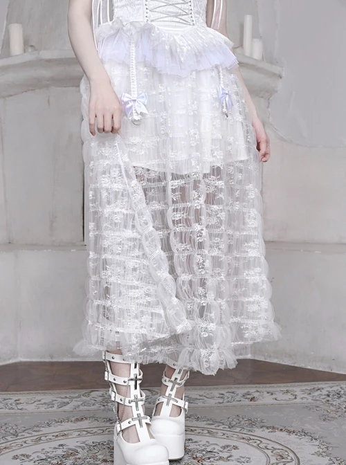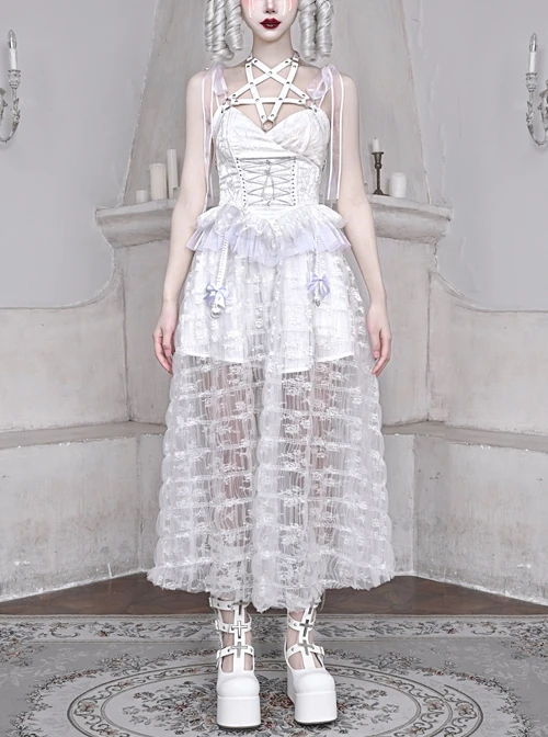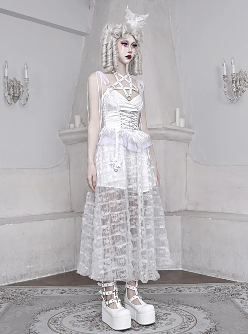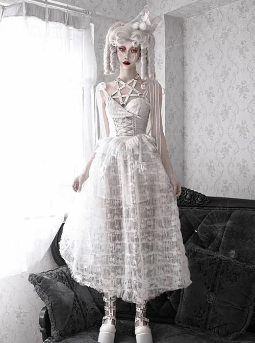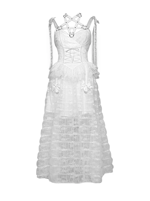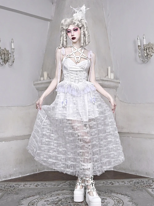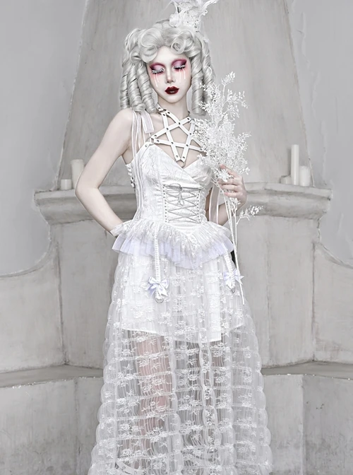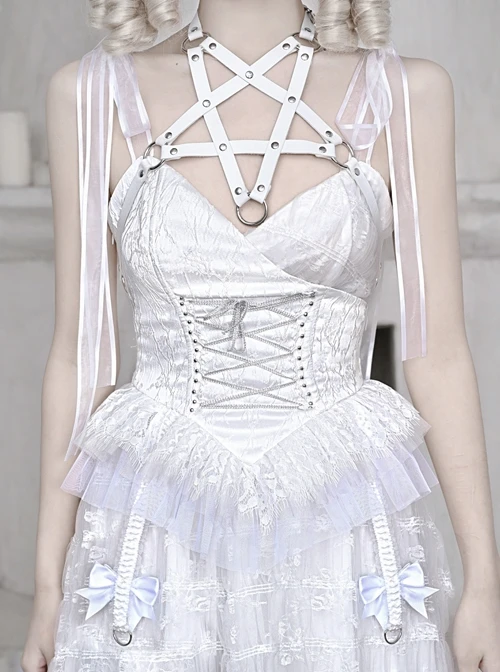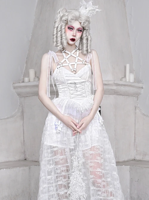 Asymmetric paneled V-neck design, delicately embossed bramble jacquard, floral chiffon fabric, detachable pentagram accessories, bell-shaped perspective lace hem design