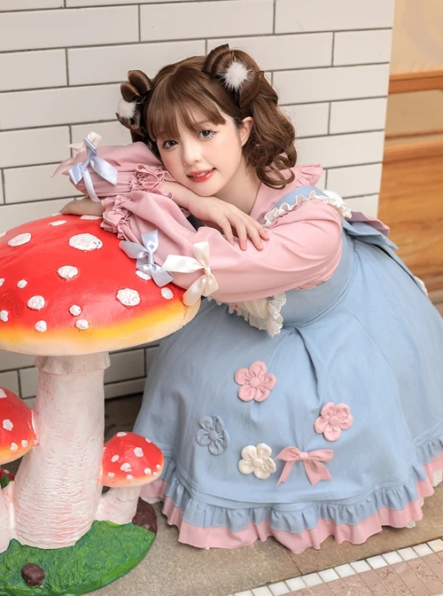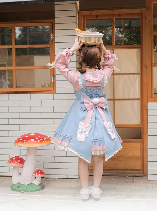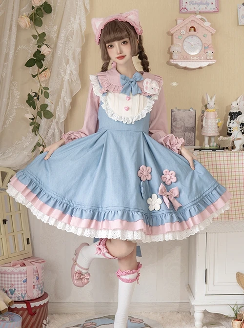 Pink doll-neck long-sleeved shirt with the same color sleeveless dress, plum flower bowknot lace decoration, bear bowknot trailing at the back, tie design at the back, sweet and cute.