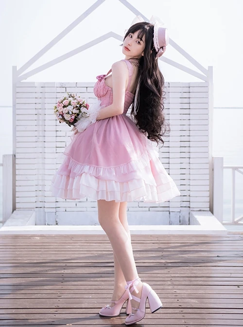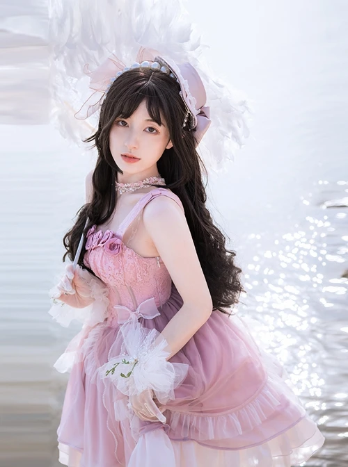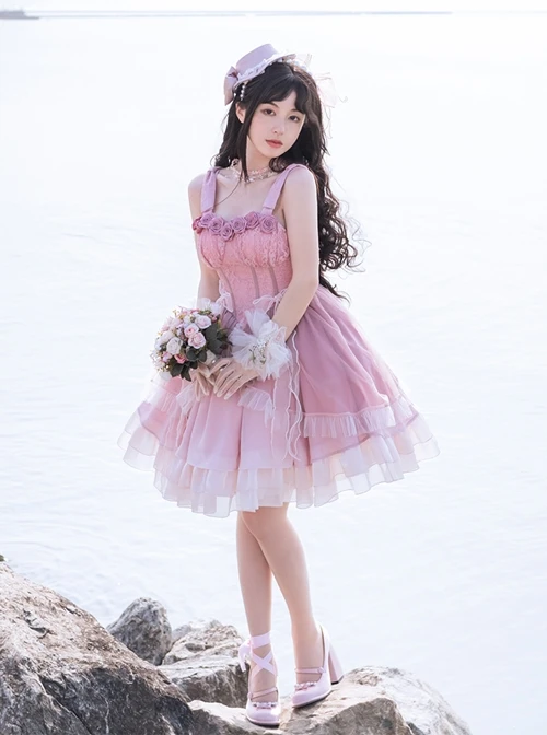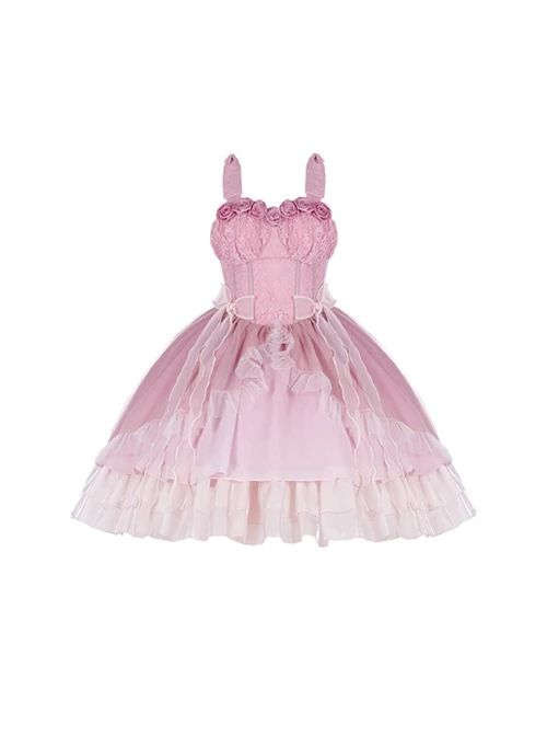 Adjustable bowknot wide shoulder strap design, pink stereoscopic rose decoration on the collar, delicate and elegant stitching lace fabric, pink gradient hem