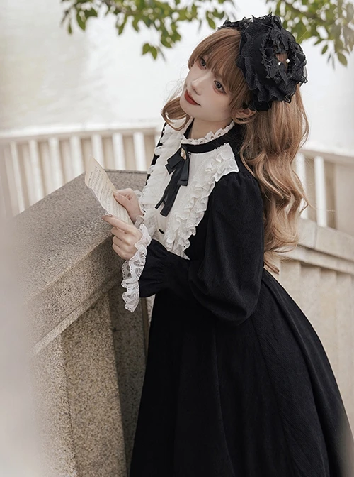 The small high collar with fungus edge is very elegant with the collar flower. The four layers of white lace on the chest show classic romance. There is an irremovable bow at the waist. The sleeves are leg-of-mutton sleeves, the large skirt is fluffy and gorgeous, and the zipper is at the back.