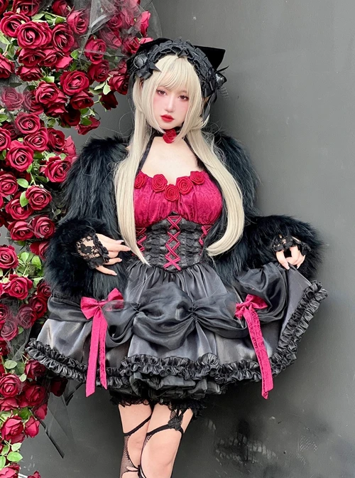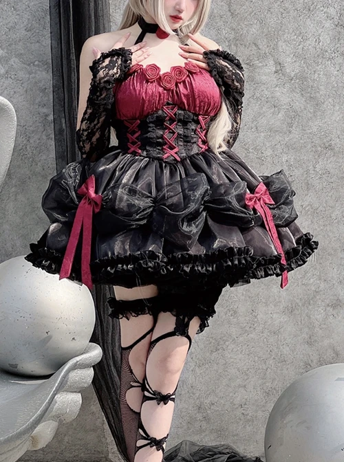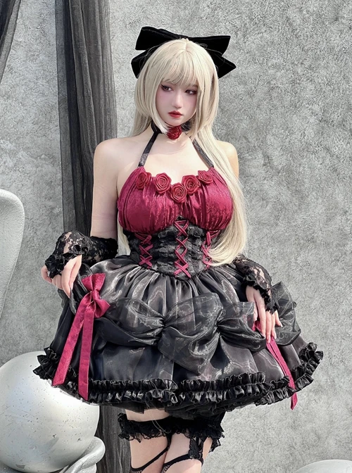 Pearlized satin stitching jacquard fabric, rose bowknot decoration, hanging neck sexy dress.