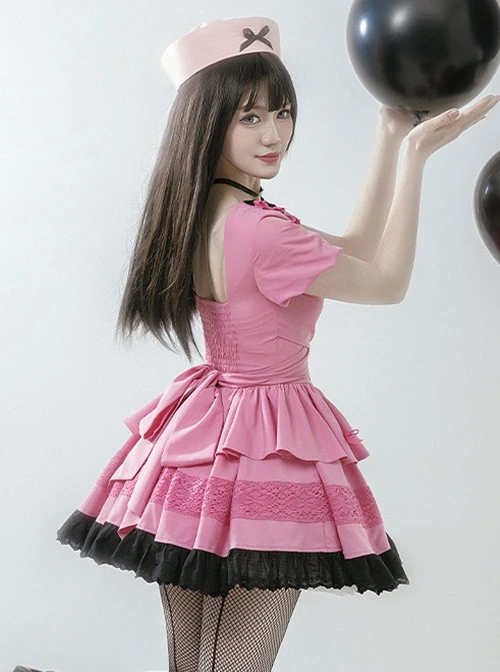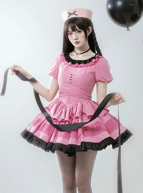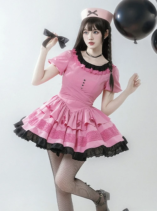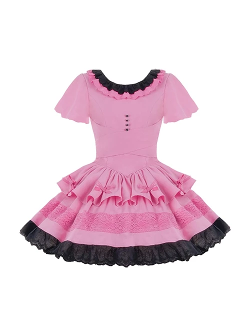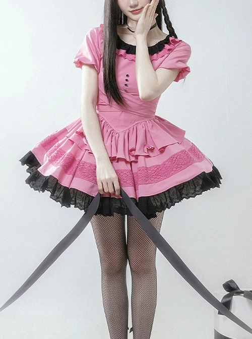 The dress is a sweet and romantic pink, with a ruffled round neck, puff sleeves, waist design, fluffy skirt, and black and pink lace with a layered feel.