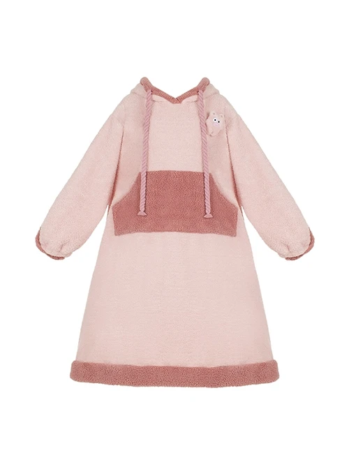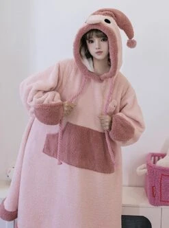 Hooded loungewear, the fit is very loose and comfortable, the pink coral velvet material is soft and warm, the hood has a cartoon blob fish face and a three-dimensional big nose, and the long dress design makes it more cute and childlike with a cute brooch.