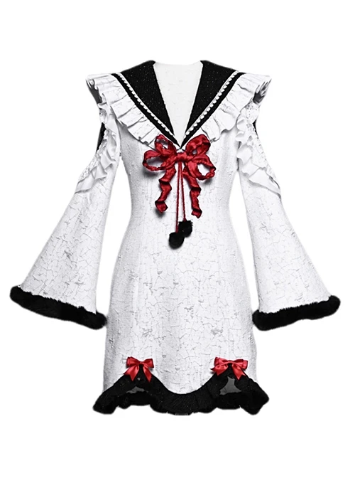 Three-dimensional embossed silver-white jacquard fabric, retro V-shaped navy large lapel design, black lace on the shoulders for perspective sexy, red bow decoration